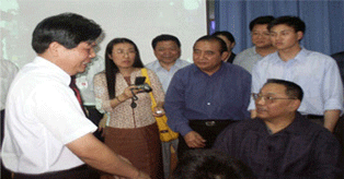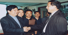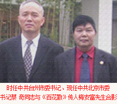 梅安富先生軍人出身(曾經在中國馬蘭核試驗基地工作十多年,為核武器發展做出了卓越貢獻、被評為八級軍殘)、高級經濟師、中共優秀黨員、天臺山人氏。現任中共鄭州臺州商會支部委員會書記、常務副會長兼秘書長、河南省保健品協會副會長、全國政協副主席、中共中央委員、中國殘聯主席鄧樸方先生與鄭州臺州商會支部書記兼秘書長、《百花散》傳人梅安富先生親切交談鄭州市腫瘤康復協會名譽會長。2005年5月,作為臺州古代中醫秘方梅氏《百花散》